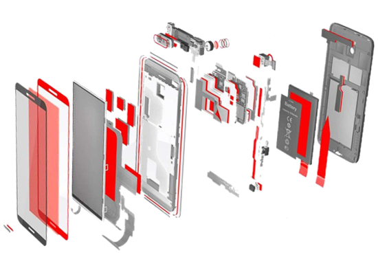 タッチパネルやウィンドウの接着、BLU(バックライトユニット)の固定、FPC・PCBの固定、グラファイトシートやモバイルパーツの接着など、あらゆる工程に対応した高機能接着ソリューションを展開。