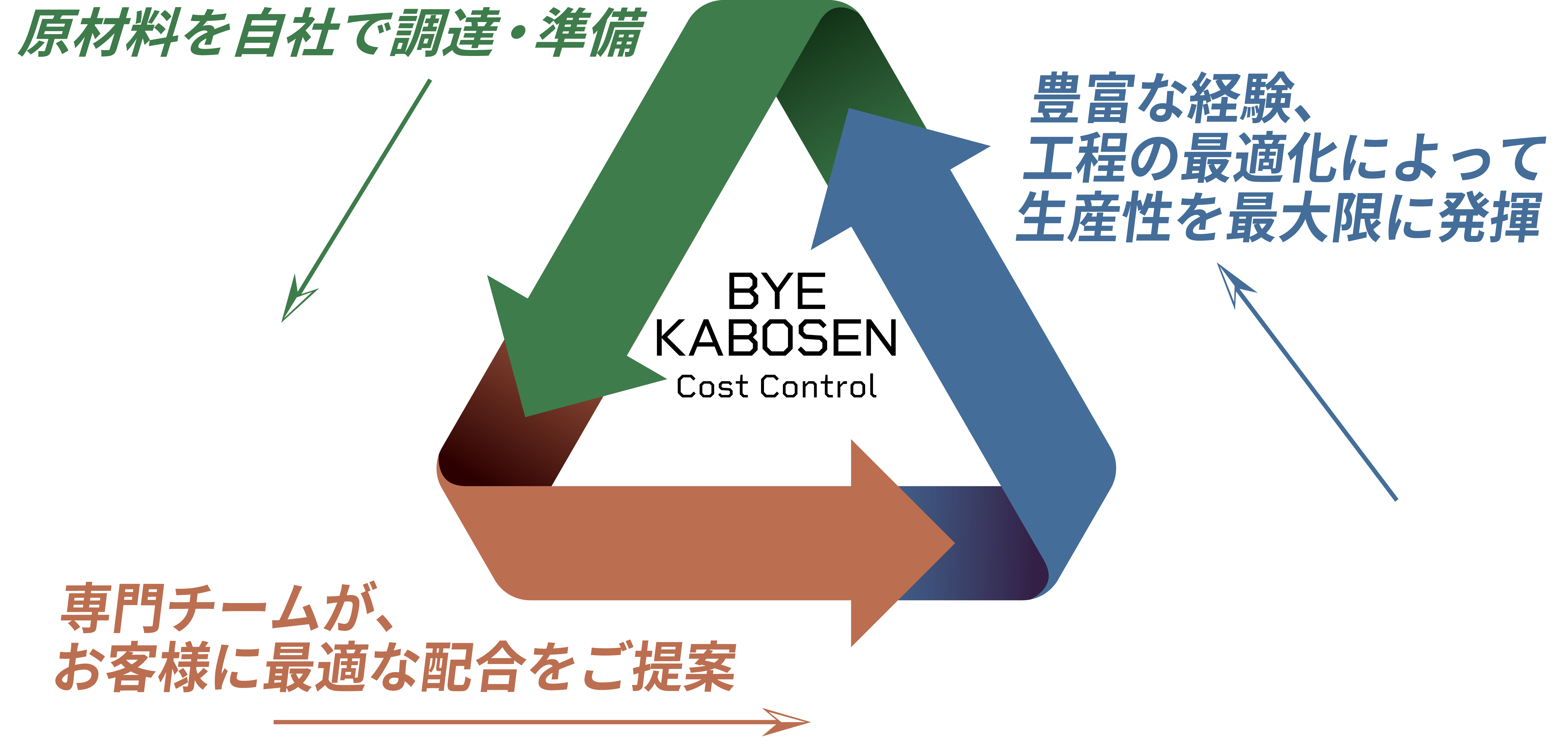 BYE KABOSENでは、原材料の選定から製造工程の最適化、そしてお客様への最適な提案に至るまで、一貫したプロセスで高品質な製品づくりを実現しています。